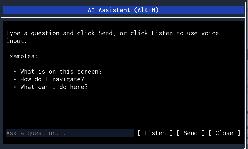 The assistant is part of the engine, not the app. Open any .melker file and press Alt+H. The AI can describe the UI, read content, and click buttons — even if the app author never thought about AI assistance. It's like having a screen reader that can also operate the controls.