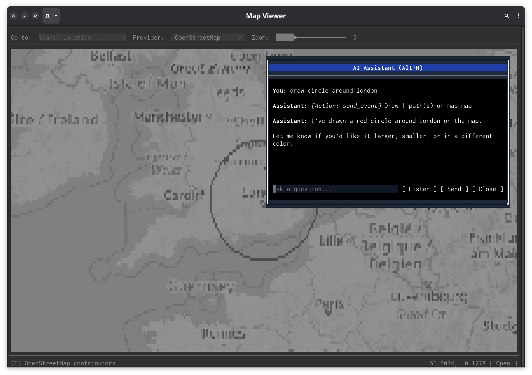 A terminal dashboard where you press F7 and say "zoom into the US east coast" or "what's the highest value in the heatmap" turns a display-only interface into something interactive without writing any handler code.